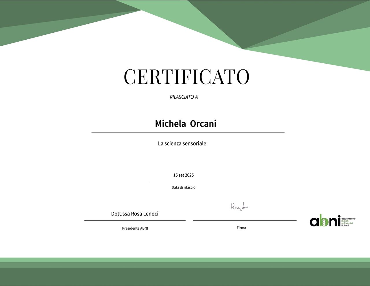 • Laureata in Scienze della Nutrizione Umana presso l'Università di Tor Vergata di Roma con una votazione pari a 110/110 e Lode il 24/05/2024