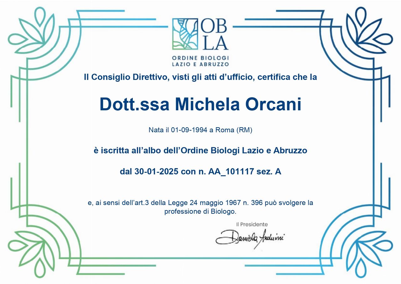 Ciao! Sono una biologa nutrizionista, mi sono laureata alla triennale in Scienze Biologiche presso l'Università La Sapienza di Roma e alla magistrale in Scienze della Nutrizione Umana presso l'Università Tor Vergata di Roma con una votazione pari a 110/110 e lode. Sono iscritta all'Albo professionale dei biologi professionisti, sezione A, con il numero di iscrizione AA_101117. Sono appassionata di nutrizione, motivo per il quale amo il mio lavoro.